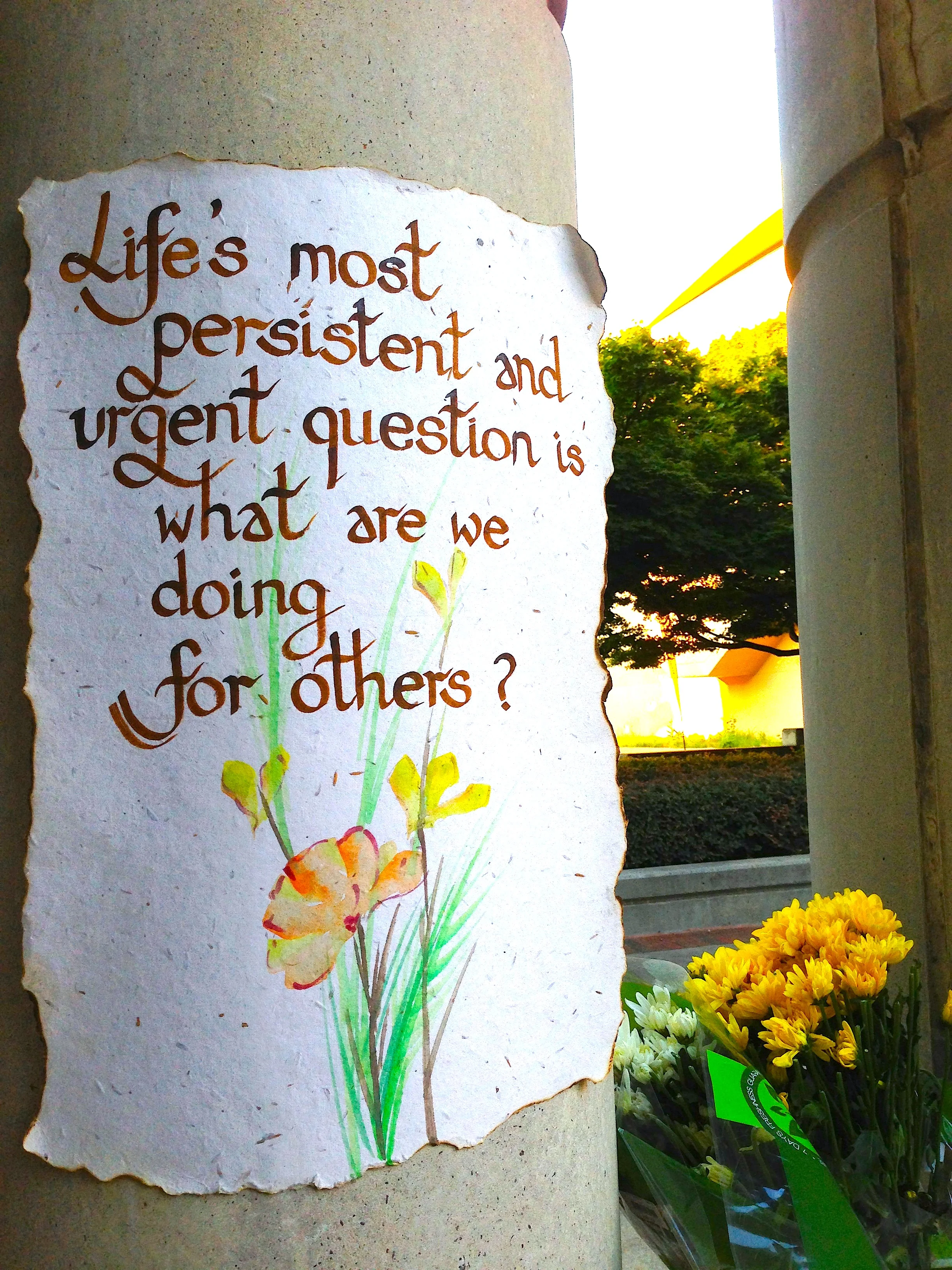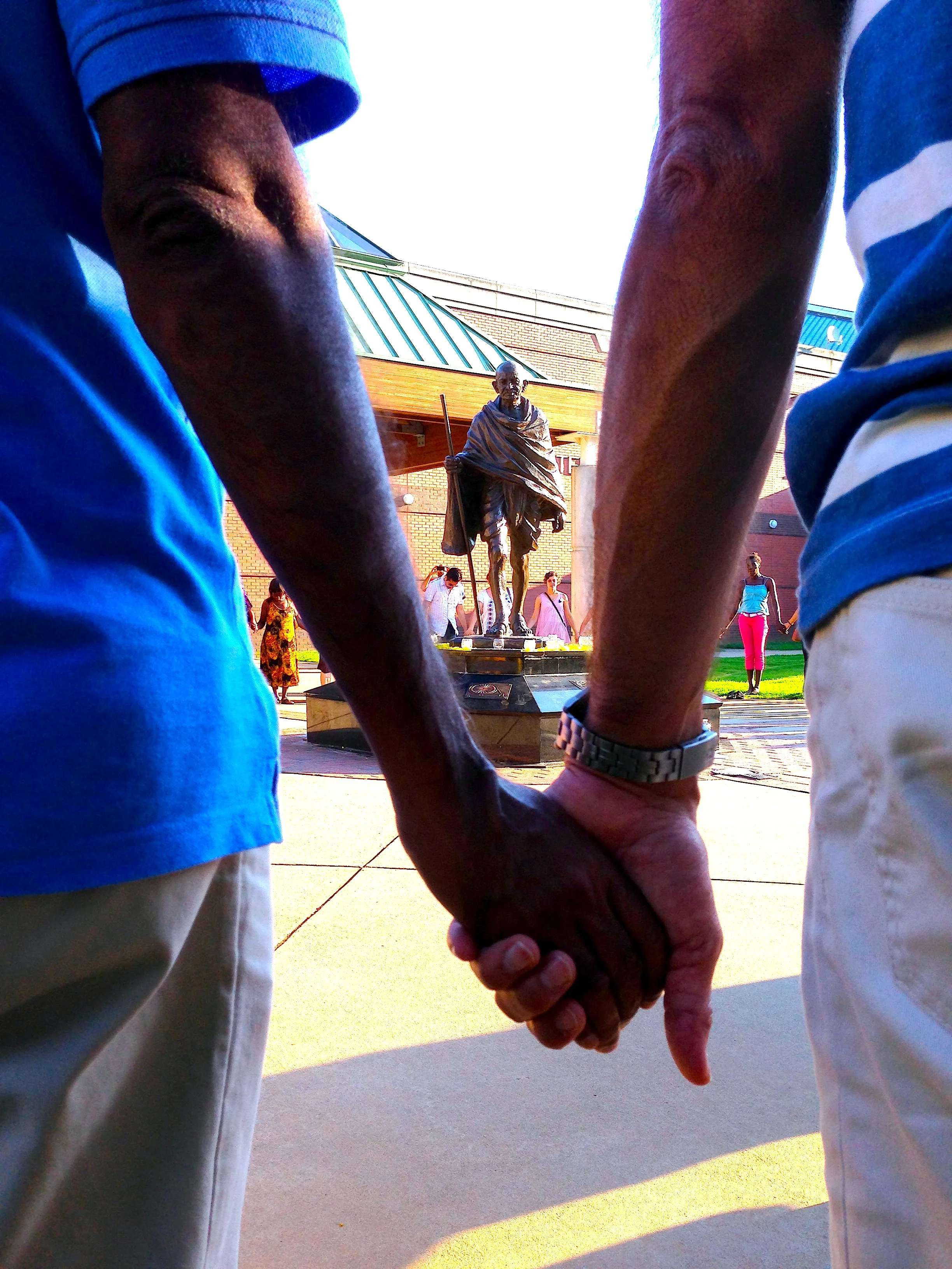Last night's gathering is filled with small moments of beauty. Somehow, conditions have aligned for us to be around the corner from Martin Luther King Jr's childhood home, across the street from the church he grew up attending (and for which he became the pastor), and just beside a stunning bronze statue of Gandhi. Neelam lives in Brooklyn half the year, and has stayed down in Atlanta a little longer to see this event through. She and Nimo lay out rugs at the for of a stunning mural of MLK Jr. and the Civil Rights Movement. Chairs somehow spring up in a semi-circle behind them. As we slip posters and banners and the one-world flag across pillars and windows and cement surfaces, a spontaneous team of youth and adults make "Free Hug" signs and shower passerby with splashes of warmth through their smiling embraces.